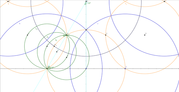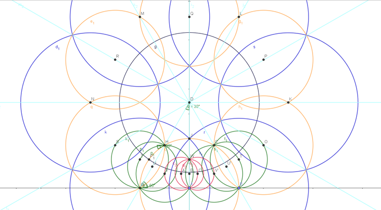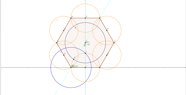 - By symmetry, construct the initial circle c as shown above by rotating around the main disc’s centre by 60 degrees as shown. Constructing the hexagon first may help simplify further construction also.