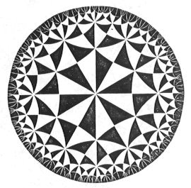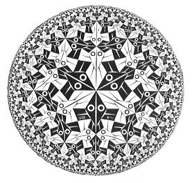 The Circle Limit is similarly just a tiling, but it is the tiling of a hyperbolic plane. Hyperbolic geometry assumes the fifth Euclidean postulate false and thus assumes that through a given point there can be more than just one parallel line to a given line. Hyperbolic geometry cannot be intuitively visualised. To visualise it, there are representations that one can use. Poincare’ disc is a model that can be understood through Euclidean geometry and used to represent hyperbolic geometry. Hyperbolic disc shall have its own hyperbolic triangles, segments and so on.