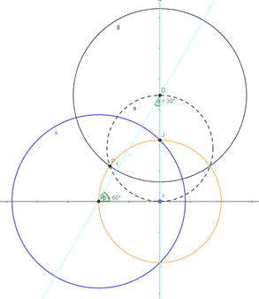 - Construct a circle with diameter DA intersecting the initial circle at P1 as shown.