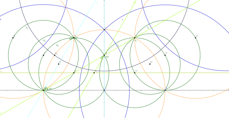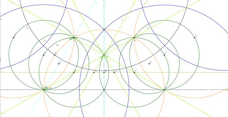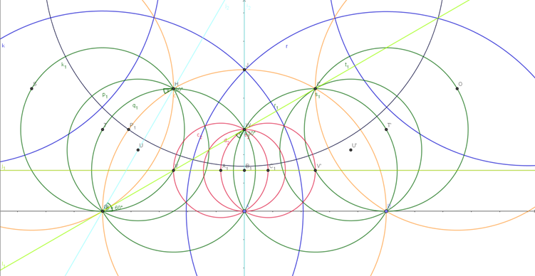 - Now we have orthogonal circles passing through H and centres at T, U, V. Keep track of the newly formed hyperbolic triangles to get a grasp of the procedural way in which this construction is proceeding.