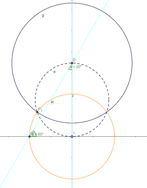 - Next construct a circle centred at G with radius GJ. Observe what this does to the triangle derived earlier. Intuitively, understanding how triangles are warped in the disc, this circle divides the triangle constructed earlier into two congruent triangles (In the hyperbolic disc all similar triangles are congruent which is yet another way to understand how the scale can vary yet the hyperbolic size remains the same while tiling the disc)