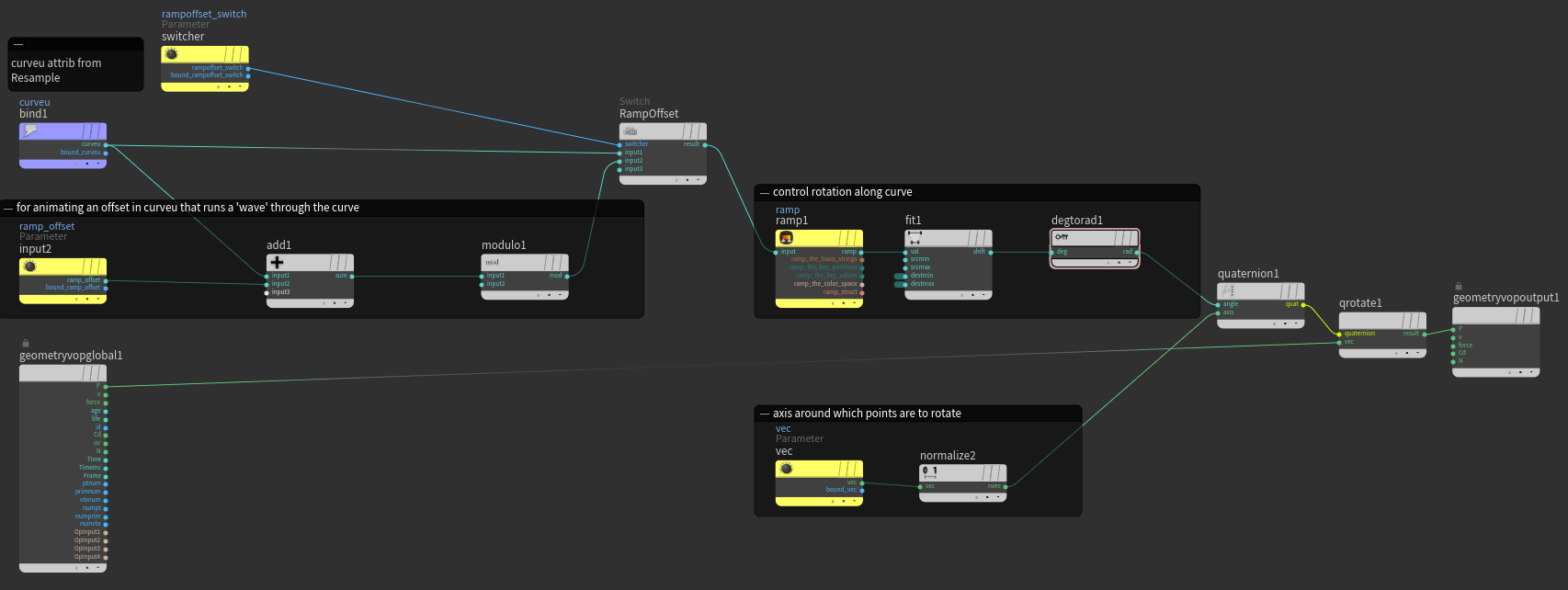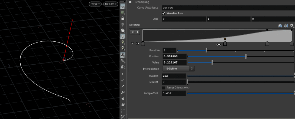 The next was building an asset that helps in rotating the points of the curve. This helps add some controlled variation and interest to the base uncoiling motion. Further smaller tweaking can be done by using Houdini 18’s new Bend SOP which is very co-operative now.