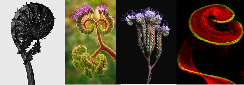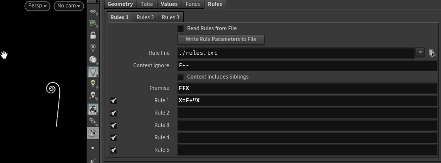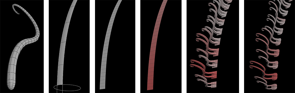 The first step was to get the basic uncoiling motion to work. This was done using an animated L system. The rules are simple to figure out keeping in mind that any basic spiral structure is a combination of rotation and incremental distances (radial acceleration). The curve rotates with every generation and scales down its length. Subdivide the curve to get an almost exponential distribution of points along the curve which will come in handy when later fleshing out the structures around it. Resample it only if regular point spacing along the curve is needed.