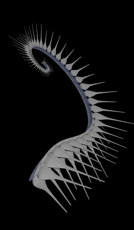 The aim of this project was to explore an uncoiling motion while designing structures that can be layered to elevate the immediate abstraction of uncoiling to be a spiral. It can be done through robust ways like having a cumulative transform by recursively shifting the rotation’s anchor point along a curve to make a basic unrolling rig. But here, it is done quite simply by combining L systems with a custom asset that rotates a curve’s points around the origin using quaternions and an axis. The modelling and layering of structures benefits a lot from using NURBS, carves and being intentional with how detail is placed along the curve. The details are not copies, they are entirely extrusions controlled by an effector ramp and the same L system that makes the larger structure.